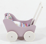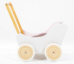 Wózek dla lalek, drewniany wózek. Czerwono-białe paseczki