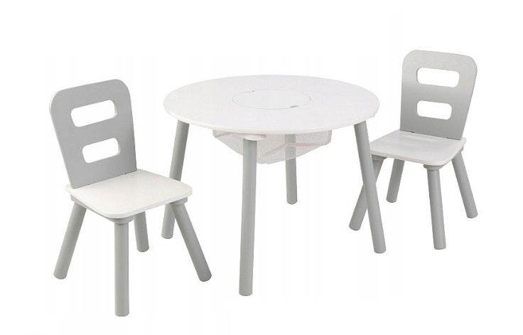 Okrągły stolik z dwoma krzesełkami wykonany z drewna w stonowanym białym kolorze z pewnością spodoba się każdemu dziecku.