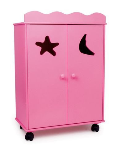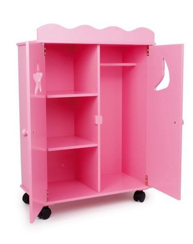 Meble dla lalek, w tym różowa szafa z dwoma półkami po lewej stronie oraz z drążkiem do zawieszenia odzieży lalki po prawej stronie to miejsce dzięki któremu pokój dziecka nabierze różowej barwy, a lalki znajdą miejsce na swoją garderobę.