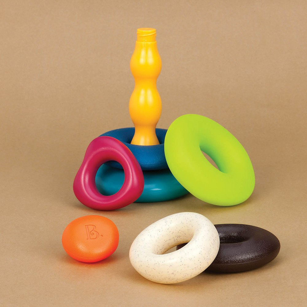 Kolorowa układanka dla dzieci uczy maluchy rozróżniania wielkości i kolorów. Zabawka dla dziecka składa się z pięciu obręczy imitujących kamienie, oraz palika na który maluszek musi nałożyć obręcze. Kolorowa układanka na palikach B.Toys uczy zdolności logicznego myślenia oraz rozwija umiejętności manualne dzieci.