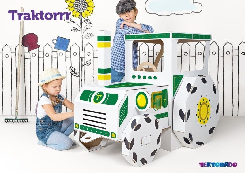 Wspaniała i wielkie maszyny to zawsze świetna inspiracja do dziecięcych zabaw. Od dziś maluchy mogą wczuć się w rolę rolnika lub ogrodnika zbierającego swoje ciężko wypracowane plony. Zabawki z tektury pozwalają rozwijać talent artystyczny i kreatywność. Po złożeniu są niezastąpione jako tło do odgrywania różnego rodzaju scen i stanowią doskonałe dekoracje do pokoju dziecka. Traktor Tektorado to klasyczny pojazd do samodzielnego złożenia, zestaw składa się z naklejek oraz elementów z wytrzymałej 5-warstwowej tektury. Już samo składanie kompletu w całość to świetna i pouczająca rozrywka. Dzieci mogą dowolnie ozdobić pojazd przy użyciu naklejek oraz pomalować go kredkami lub farbami by stał się jedyny w swoim rodzaju. Traktorek nie posiada siedziska, ale można do niego wejść żeby usiąść lub uklęknąć.