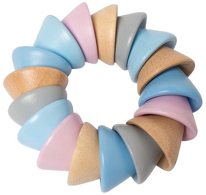 Drewniane elementy gryzaka pokryte zostały specjalnymi, nietoksycznymi farbami na bazie wody, dzięki czemu już najmłodsze dzieci mogą swobodnie manipulować zabawką. Solidne drewniane elementy, które przyniosą ulgę podczas ząbkowania, osadzone zostały na elastycznej lince, dzięki czemu zabawkę można rozciągać i ugniatać. Tęczowy wianek pełni rolę gryzaka jednak świetnie stymuluje również rozwój motoryki małej.