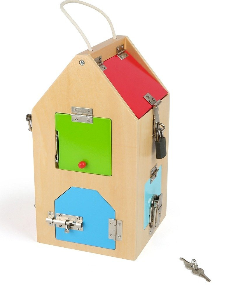 • Drewniany dom z ośmioma różnymi zamkami umożliwi ćwiczenie umiejętności motorycznych najmłodszych. Ciekawe, czy każde dziecko poradzi sobie z wszystkimi zamkami (kłódką, łańcuchem bezpieczeństwa, dźwignią, suwakiem, przekładką i inn.) i ot