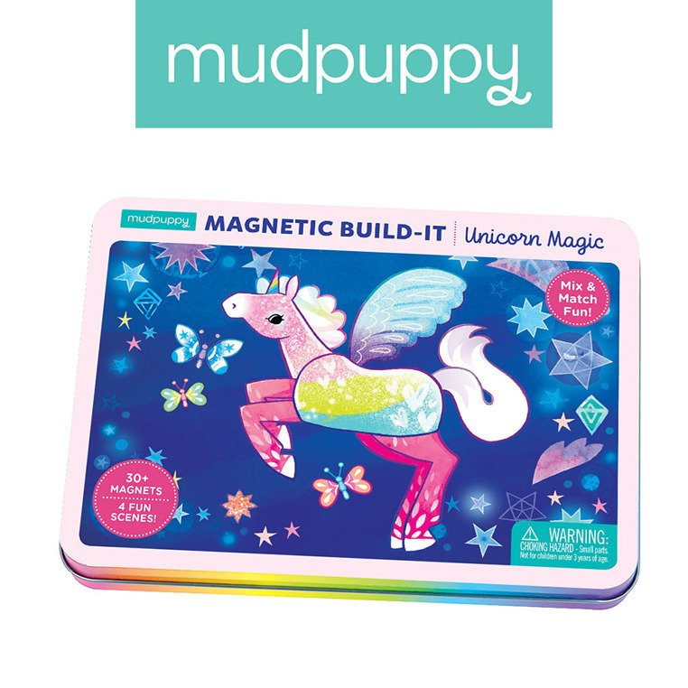 Zestaw magnesów do konstruowania Magiczne jednorożce amerykańskiej marki MUDPUPPY to wyjątkowo kreatywna zabawka dla dzieci od 4 roku życia. Na 2 dwustronnych magnetycznych (cynowych) planszach znajdują się magiczne tła, na których można tworzyć kolorowe jednorożce z wybranych magnetycznych elementów. Podczas zabawy da się nie tylko kreować coraz to nowe stworzenia, ale też snuć o nich niezliczone opowieści. Zestaw zawiera ponad 30 magnesów. Autorką ilustracji jest brytyjska rysowniczka Katie Wood. Zabawka ma poręczny format, sprawdza się w domu i w podróży. Zapakowana jest w estetyczne, metalowe pudełko. Doskonale nadaje się na prezent.