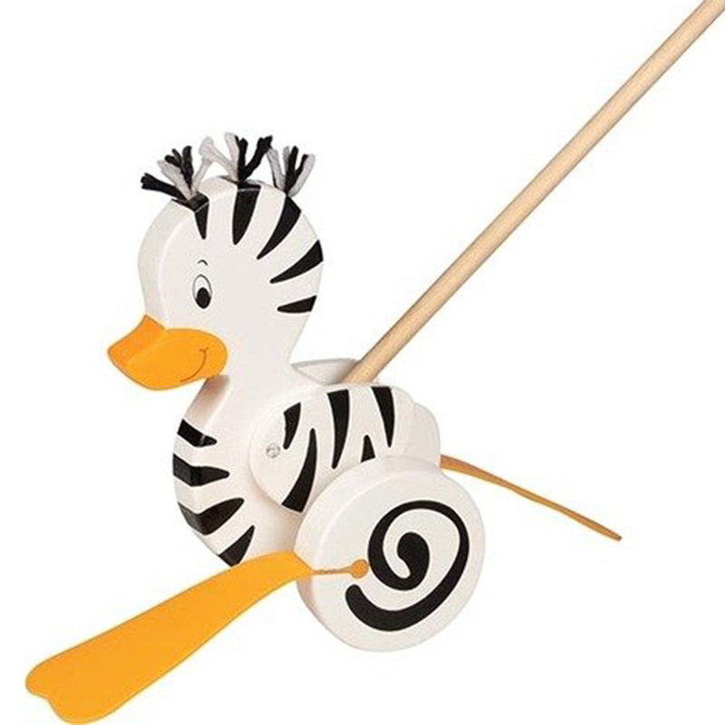 Zabawny pchacz dla dzieci Czarno- biała kaczuszka marki Goki to idealny pomysł na prezent na roczek, jeździk do pchania pomoże naszemu smykowi ćwiczyć zmysł równowagi, koordynację ruchową oraz dobrze się bawić na świeżym powietrzu.
