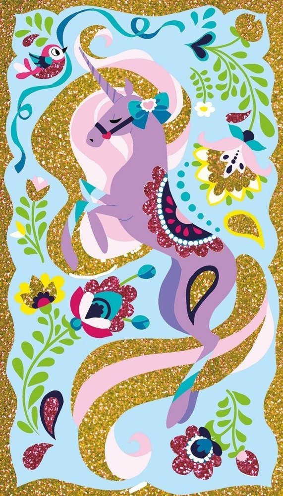 Zestaw kreatywny Magiczny brokat Jednorożce francuskiej marki JANOD zawiera 3 plansze-obrazki z powłoką samoprzylepną, z jednorożcami w otoczeniu kwiatów i bajecznej roślinności. Ilustracje te można – w wyznaczonych miejscach – posypać dołączonym do zestawu brokatem w tubkach, w 2 kolorach: złotym i ciemnoróżowym. Brokat przykleja się do obrazków, pozostawiając na nich drobną strukturę. W komplecie znajduje się też szpatułka do odkrywania powierzchni, przeznaczonych do ozdabiania i równomiernego rozprowadzania brokatu. Ozdabianie brokatem to dla dziecka długie godziny angażującej i jednocześnie uspokajającej, wyciszającej zabawy, a gotowe obrazki staną się wspaniałym elementem dekoracyjnym dziecięcego pokoju.