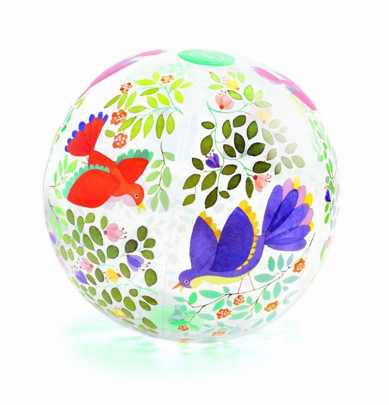 Przezroczysta, nadmuchiwana piłka od Djeco z kolorową grafiką przedstawiającą piękne kwiaty i ptaki do zabawy nie tylko na plaży.