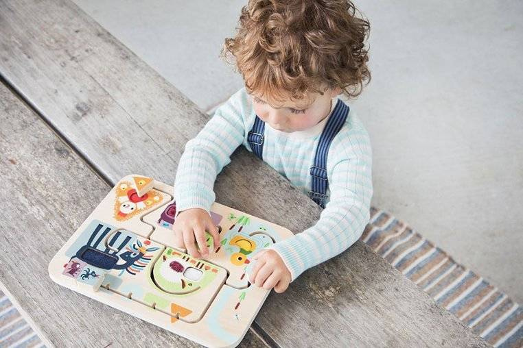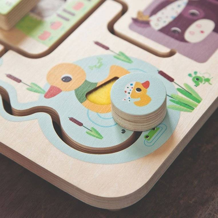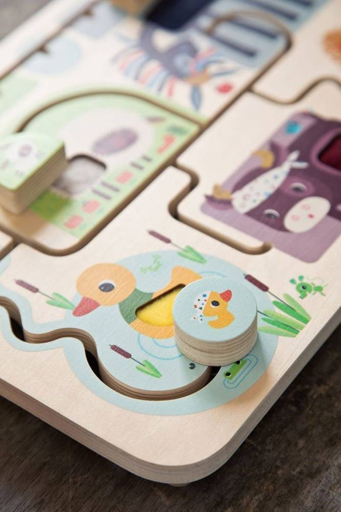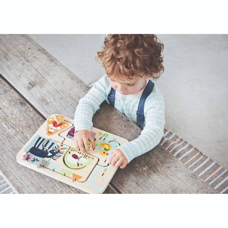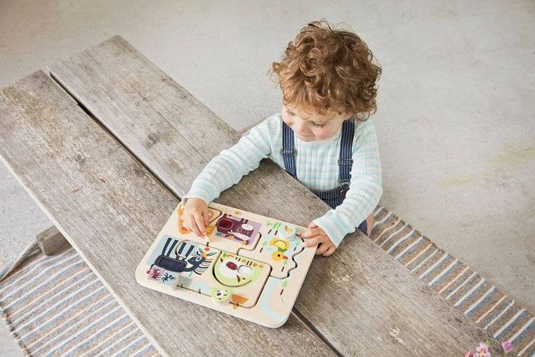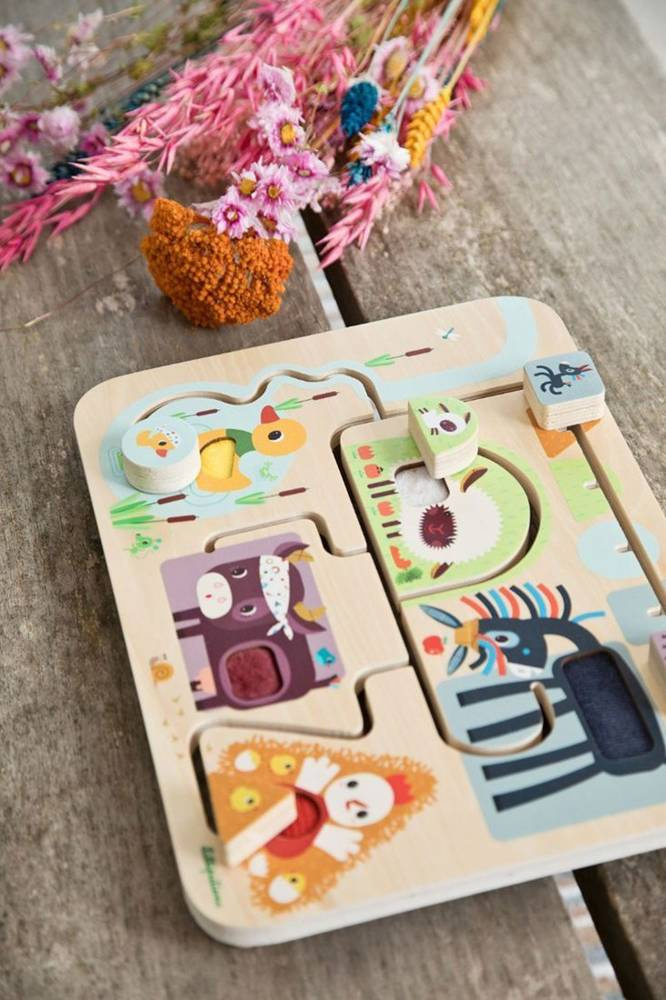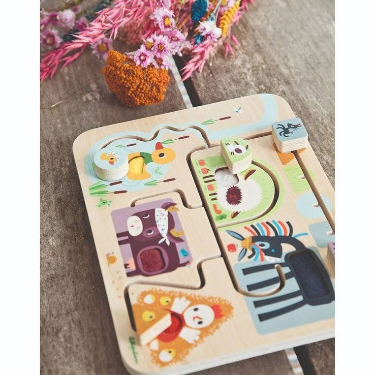 Drewniana tablica sensoryczna z labiryntem to kolejna propozycja wielofunkcyjnej, aktywizującej zabawki belgijskiej marki Lilliputiens. Planszę ozdabiają wymalowane postacie zwierzątek typowym dla marki. Zadaniem dziecka jest przesunięcie klocków po odpowiednim torze, tak aby trafiły w wyznaczone miejsce. Podczas zabawy maluch popracuje nad koordynacją ręka - oko, czy też rozwinie zdolności motoryczne. Ta zabawka angażuje i pobudza zmysł wzroku oraz kształtuje umiejętność logicznego myślenia. Sprawdzi się doskonale jako prezent dla każdego dziecka.