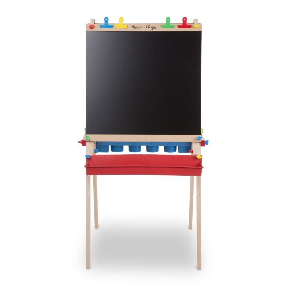 Drewniana tablica edukacyjna Melissa & Doug zamienia każde pomieszczenie w pracownię artystyczną. Dwustronna sztaluga artystyczna o regulowanej wysokości w rozmiarze dziecięcym zawiera tablicę do ścierania na sucho, tablicę kredową, blokowany uchwyt rolki papieru, bezpieczną dla dzieci gilotynę do papieru, cztery łatwe - zaciski na uchwyt i plastikową tackę do przymocowania po obu stronach sztalugi. Montaż jest prosty, więc na kolejne arcydzieło nie trzeba długo czekać. Sztalugi dla dzieci są zalecane do rozwijania umiejętności motorycznych i prawidłowego chwytu ołówka — są świetne dla początkujących pisarzy i malarzy. Użyj powierzchni tablicy jako idealnej powierzchni do ćwiczenia pierwszych liter i słów dziecka. Farby, kubki i pędzle sprzedawane są oddzielnie.
