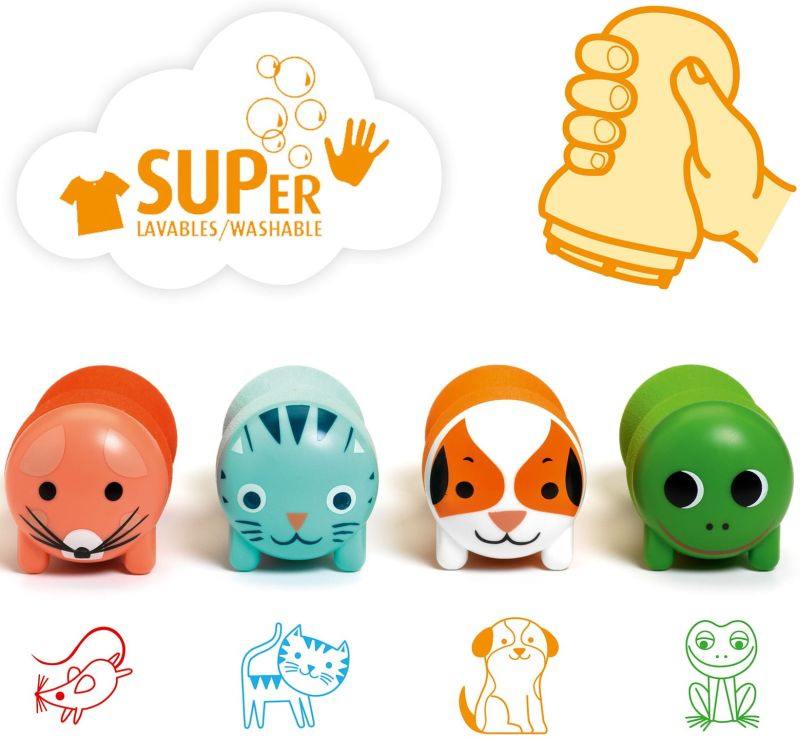W zestawie znajdują się 4 piankowe stemple z motywem zwierzątek takich jak: kotek, piesek, krecik i żabka.