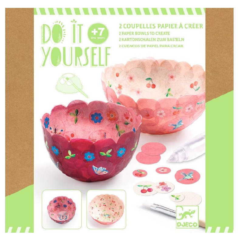W komplecie DIY papierowe miseczki różowe od Djeco znajdują się wszystkie niezbędne do stworzenia 2 mis ozdobnych akcesoria plastyczne: