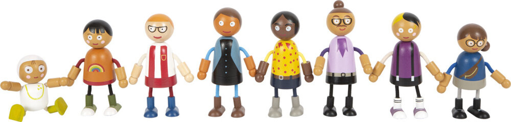 Zestaw drewnianych, giętkich lalek Rodzina z dzieckiem to kolejna odsłona lalek patchworkowych marki Small Foot będących niezależną zabawką lub też uzupełnieniem domku dla lalek. Zestaw zawiera 8 laleczek różnej płci i w różnym wieku, a wśród nich znajduje się niemowlę w nosidełku. Ta wykonana przy zastosowaniu solidnego drewna zabawka sprzyja maluchowi w zakresie łatwiejszego wejścia w relacje międzyludzkie. Te drewniane, ruchome laleczki przeznaczone są dla dzieci od 3 roku życia.