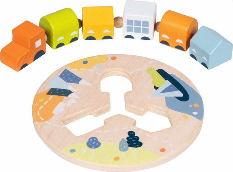 Zabawa polega na przeciąganiu pociągu przez odpowiednie otwory w dołączonej do zestawu tarczy.