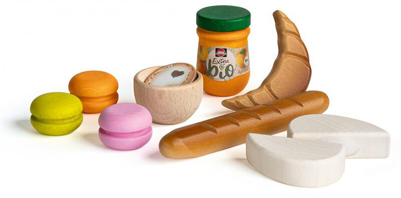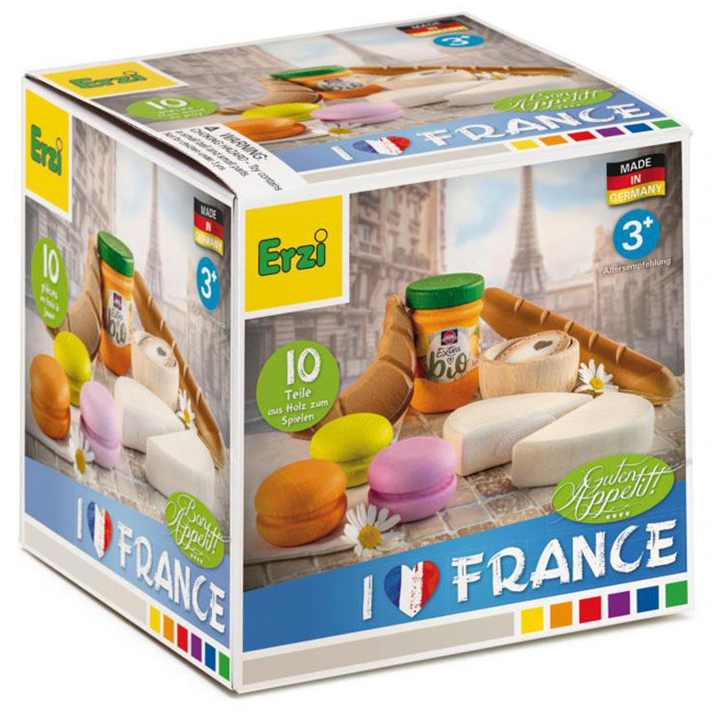 Drewniany zestaw do gotowania Francja marki Erzi przeniesie każde dziecko w kulinarny świat tego europejskiego państwa. Każdy z 10 elementów został wykonany z wysokiej jakości drewna buku i pomalowany bezpiecznymi farbami. Z tym zestawem apetycznie wyglądającego jedzenia maluch wcieli się w rolę kucharza, właściciela piekarni lub hotelu.