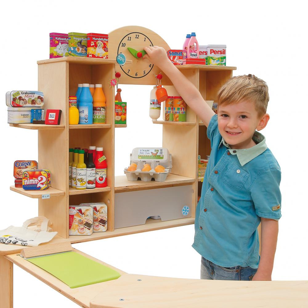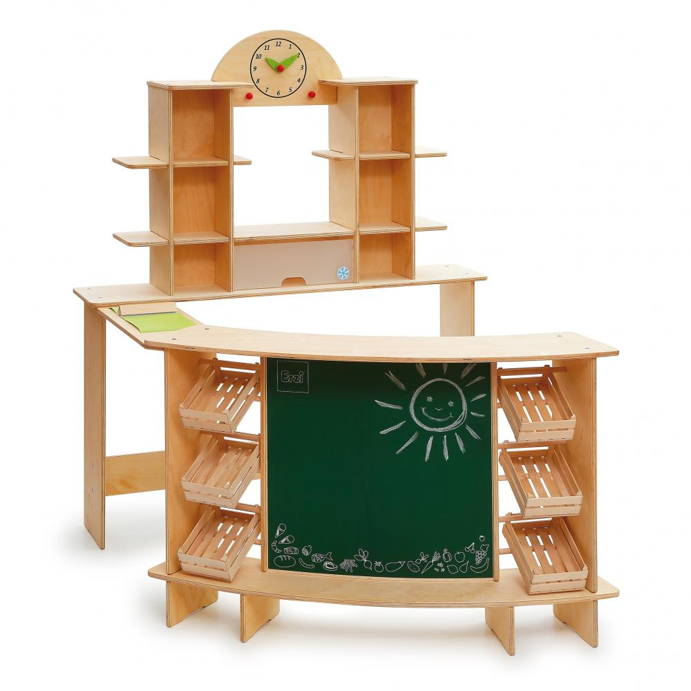 Drewniany sklep Erzi Shop Premium XL to gwarancja znakomitej zabawy w sprzedaż lub wyprawę po codzienne sprawunki. Stoisko wykonane zostało z solidnej sklejki brzozowej. Na wyposażeniu sklepu znajduje się zegar z ruchomymi wskazówkami, lodówka do przechowywania artykułów wymagających niskiej temperatury, tablica kredowa do zapisywania informacji o promocjach, liczne półki, w tym regulowane, a także drewniane skrzynki na owoce i warzywa. Sklep dla dzieci Erzi Shop Premium XL wyprodukowany został w Niemczech, a o jego wysokiej jakości świadczą certyfikaty CE i ASTM.