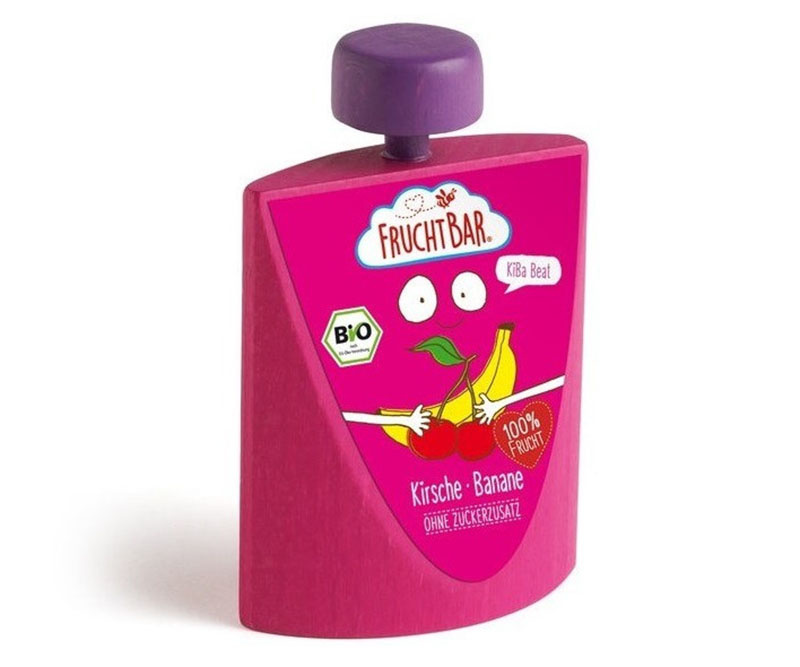 Niemiecka marka Erzi pobudza dziecięcą wyobraźnię i zachęca do zabawy w odgrywanie ról dzięki szerokiej ofercie produktów spożywczych w formie replik z drewna. Drewniany mus owocowy Squeezy Cherry Banana Fruchtbar Erzi to zabawkowa wersja popularnego musu z bio owoców o smaku banana i wiśni. Zabawka została wyprodukowana w Niemczech z malowanego drewna buku. Wysoką jakość wykonania zabawki podkreślają certyfikaty CE i ASTM.