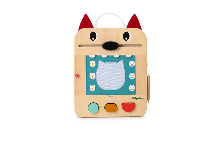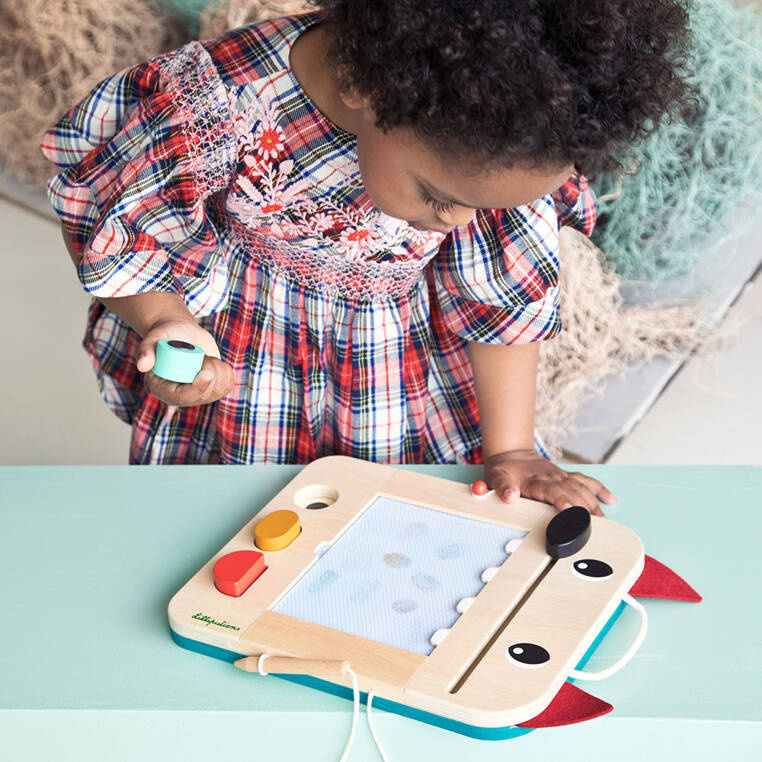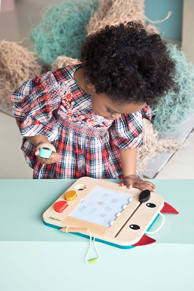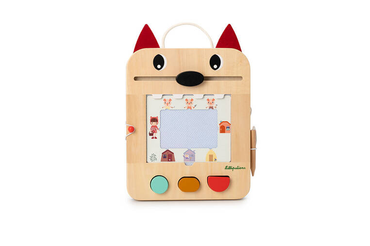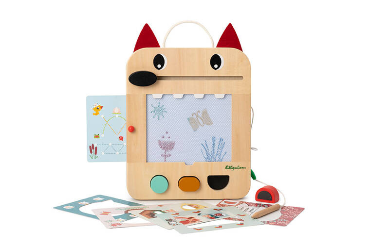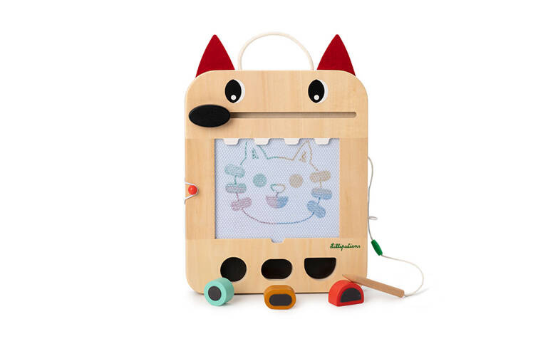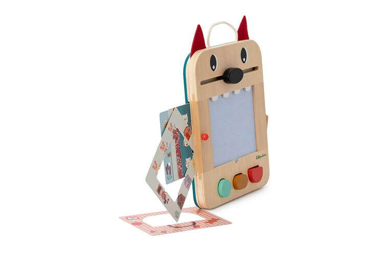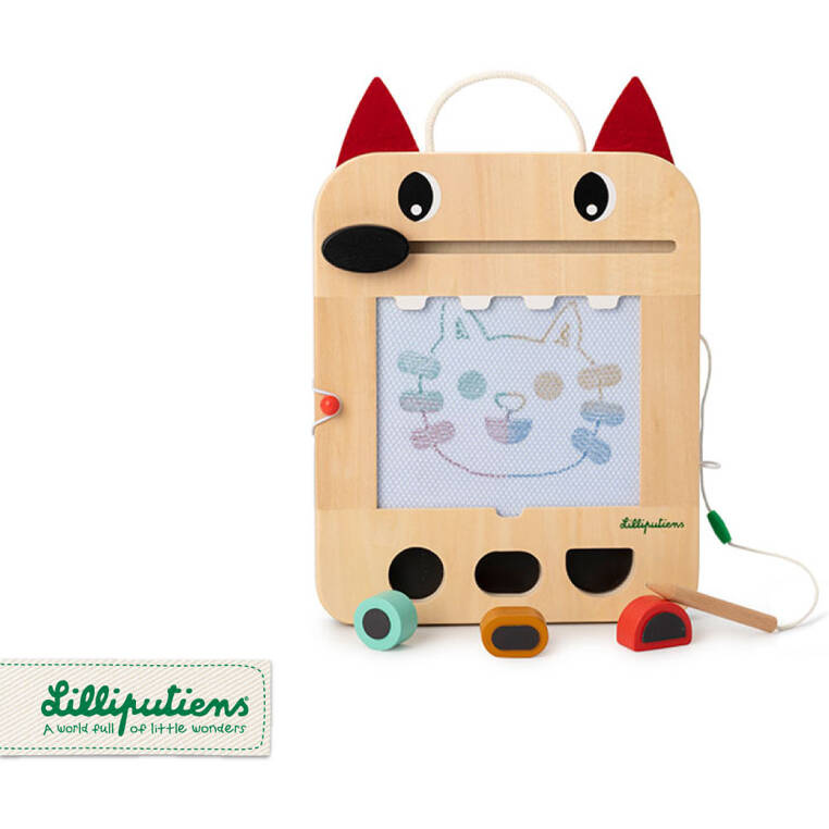 Drewniana tablica znikopis Wilk Louis Lilliputiens to kolejna propozycja aktywizującej zabawki od belgijskiej marki Lilliputiens. Tablica posiada charakterystyczny wygląd pod postacią Wilka z otwartą paszczą, filcowymi uszami w kolorze czerwonym i czarnym nosem, którego przesunięcie uruchamia mechanizm zamazywania ekranu. Zestaw zawiera także 6 kart z propozycjami zabaw i 3 magnetyczne klocki do rysowania. Podczas zabawy maluch popracuje nad koordynacją ręka - oko, czy też rozwinie zdolności motoryczne. Ta zabawka angażuje i pobudza zmysł wzroku, dotyku oraz kształtuje umiejętność logicznego myślenia. Sprawdzi się doskonale jako prezent dla każdego dziecka.