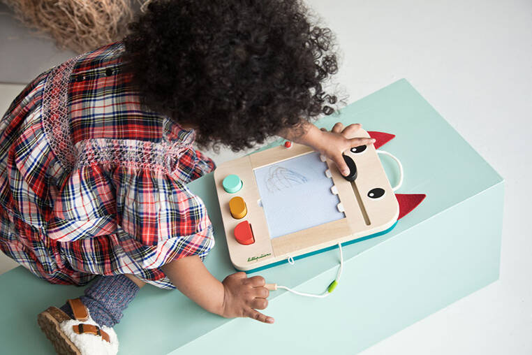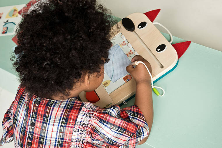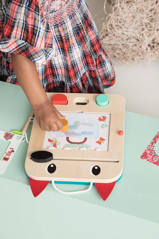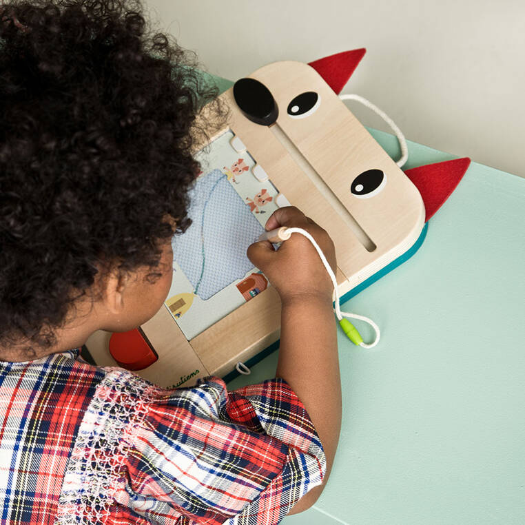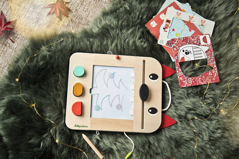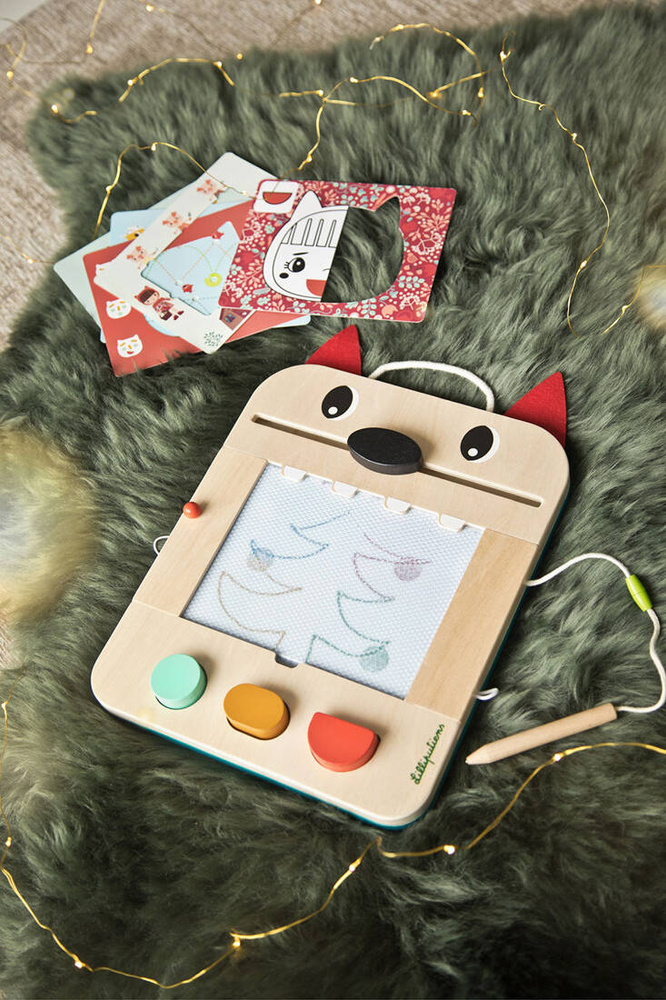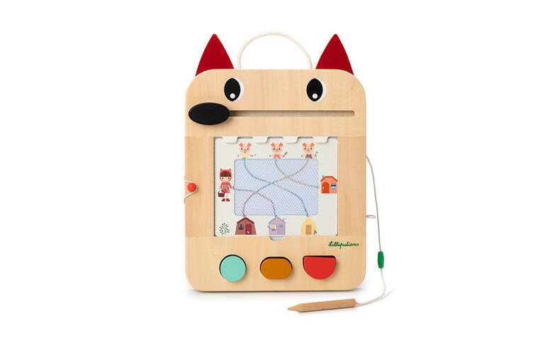 Drewniana tablica znikopis Wilk Louis Lilliputiens to kolejna propozycja aktywizującej zabawki od belgijskiej marki Lilliputiens. Tablica posiada charakterystyczny wygląd pod postacią Wilka z otwartą paszczą, filcowymi uszami w kolorze czerwonym i czarnym nosem, którego przesunięcie uruchamia mechanizm zamazywania ekranu. Zestaw zawiera także 6 kart z propozycjami zabaw i 3 magnetyczne klocki do rysowania. Podczas zabawy maluch popracuje nad koordynacją ręka - oko, czy też rozwinie zdolności motoryczne. Ta zabawka angażuje i pobudza zmysł wzroku, dotyku oraz kształtuje umiejętność logicznego myślenia. Sprawdzi się doskonale jako prezent dla każdego dziecka.