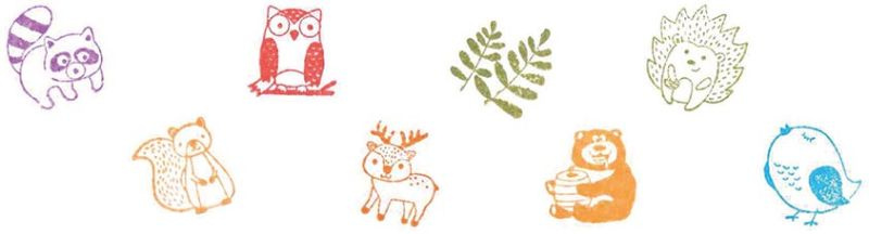 W pakiecie przewidziano 8 pieczątek z motywem roślin i zwierzątek z lasu. Wśród wzorów takie postaci jak np.: sowa, sarna, jeż czy szop.
