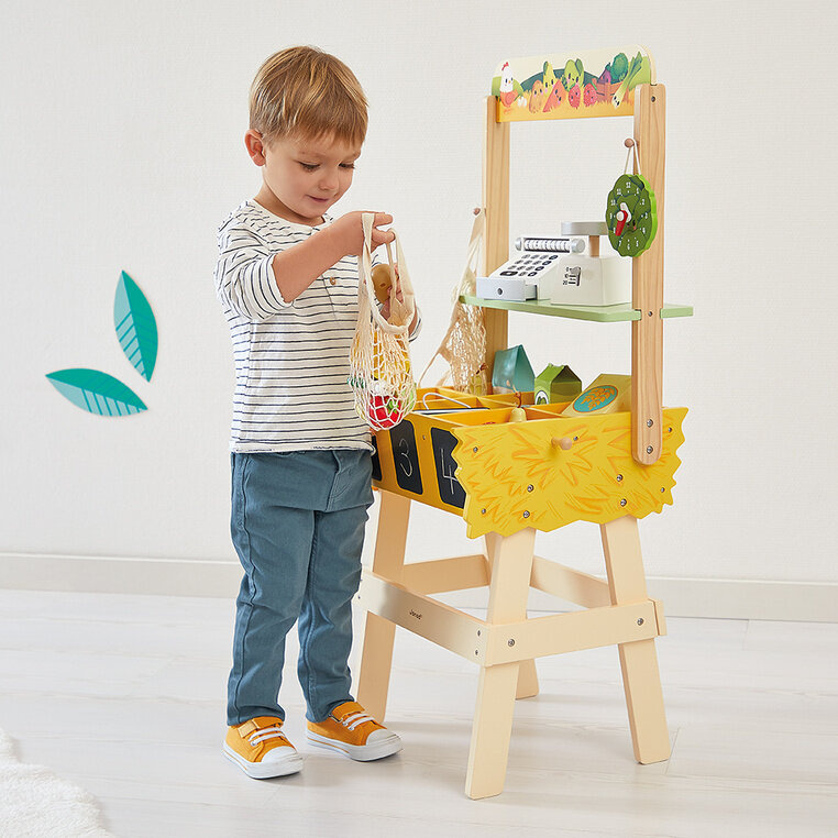 Drewniany sklep - warzywniak z akcesoriami Farma to zestaw, który zachwyci każdego malucha, a w szczególności tego, który interesuje się tematyką sklepu i zakupów. Maluch będzie mógł zaprosić do wspólnej zabawy kogo tylko zechce, co z kolei wpłynie na rozwój relacji społecznych. To stworzone z wysokiej jakości drewna stoisko do sprzedaży warzyw, wpłynie także na kreatywność i motorykę dziecka. Zabawka przeznaczona dla dzieci w wieku 3 lat i starszych.