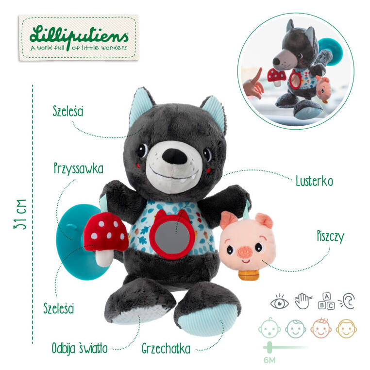 Wielofunkcyjna przytulanka na przyssawce Wilk Louis Lilliputiens to niebanalne, miękkie i wielofunkcyjne źródło rozrywki i nauki dla ciekawskich maluszków. Uroczy szary Wilczek Louis jest idealnym kompanem podróży – posiada przyssawkę pozwalającą zamontować ją od wewnątrz na szybie samochodowej.