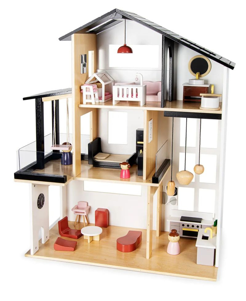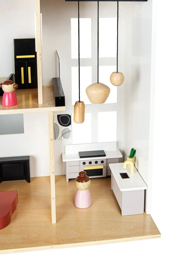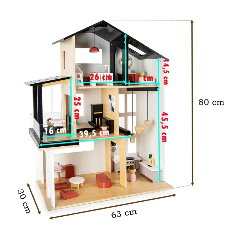 Nowoczesny domek dla lalek z tarasem charakteryzuje design w stylu loftowym. Ten niesamowity domek posiada dwa piętra pełne pomieszczeń do zabawy. Wyróżnia go kompletne wyposażenie: meble, akcesoria, laleczki. Na uwagę zasługuje solidna konstrukcja z drewna. Piękny, drewniany domek dla lalek gwarantuje rozwój przez zabawę, rozwija wyobraźnię i kreatywność dziecka.