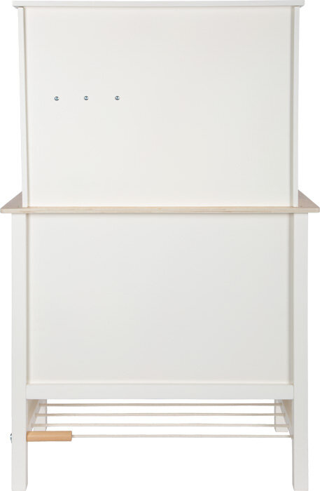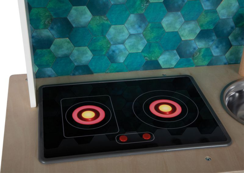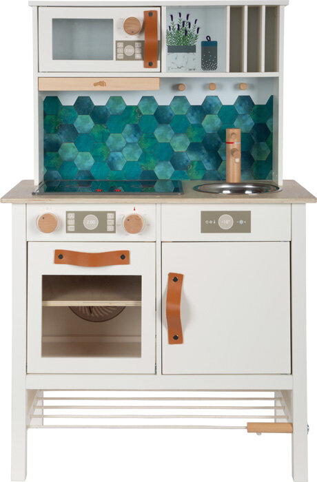 Solidna kuchnia do zabawy Small Foot robi wielkie wrażenie dzięki połączeniu klasycznej bieli z uchwytami ze skóry ekologicznej w kolorze koniaku. Całość dopełniają elementy, takie jak odwracany panel tylny (wygląd prosty/kafelkowy) oraz powierzchnie lodówki i piekarnika z nadrukowanymi detalami kuchennymi. Blat, obrotowe pokrętła „klik”, elektroniczna płyta kuchenna ze światłem/dźwiękiem, metalowa umywalka, schowek na przybory i piekarnik ze zdejmowaną blachą do pieczenia, która pełni również funkcję tablicy do pisania zapewniają realistyczne wrażenia podczas zabawy. A oto plus: chowany okap! W zestawie również niezbędne akcesoria kuchenne: garnek, patelnia i przybory, aby wszystko było gotowe do zabawy. Wymarzona kuchnia w miniaturowym formacie, która spełni wszystkie życzenia. Dzieci, które są zafascynowane gotowaniem, mogą naprawdę puścić wodze fantazji dzięki tej kuchni do zabawy, a rodzice dbający o design tak bardzo kochają ten styl, że chcieliby zobaczyć ten model kuchni do zabawy nie tylko w przedszkolu, ale także w swoim domu. Kuchnia dziecięca do zabawy wyposażona jest w gumowe korki, które chronią podłogę przed ewentualnymi zarysowaniami.