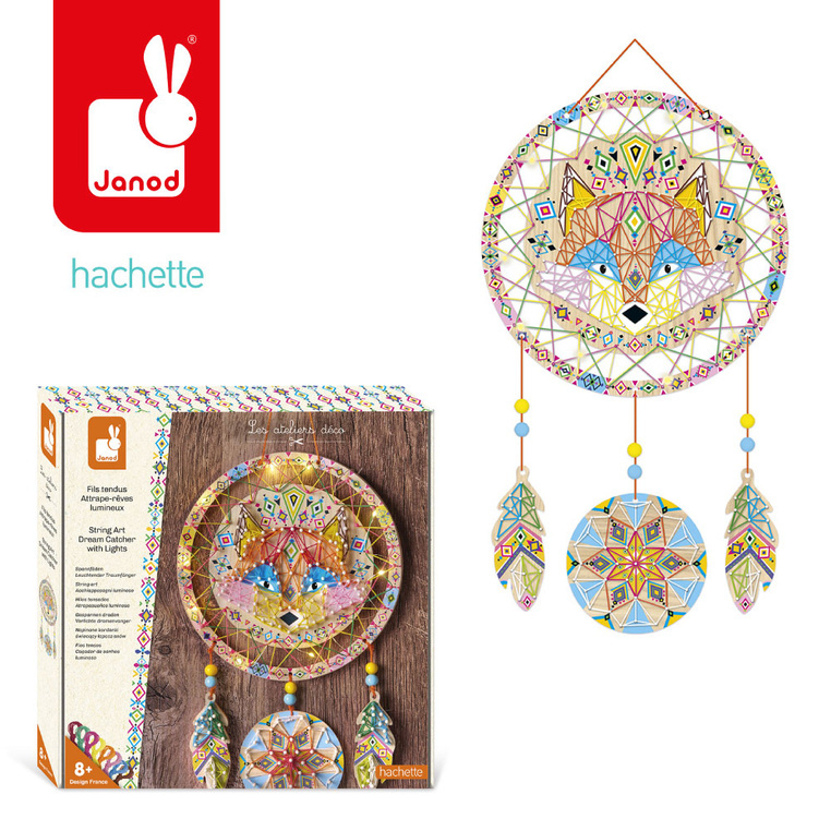 Twórcza zabawa i wyjątkowa dekoracja w jednym. Przeplatanka 3D String art Świecący łapacz snów Janod to zestaw, który pozwala dziecku własnoręcznie stworzyć piękny, podświetlany łapacz snów. W komplecie znajdują się kolorowe elementy, mulina, gwoździki i lampki LED, które dodają ozdobie magicznego blasku.