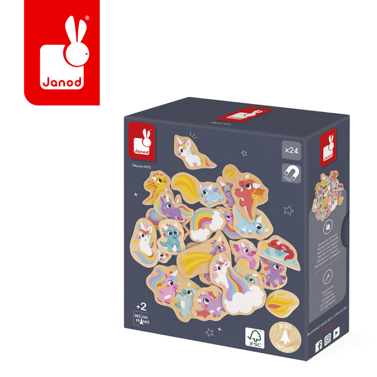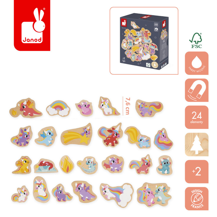 Magnesy drewniane dla dzieci Jednorożce i smoki 24 szt. Janod