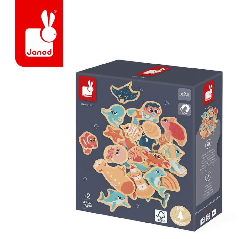 Magnesy drewniane dla dzieci Podwodny świat 24 szt. Janod to kolorowa podróż do głębin oceanu. Dzięki nim maluch pozna fascynujące stworzenia morskie i rozwinie swoją ciekawość świata. Idealna zabawa dla małych odkrywców.