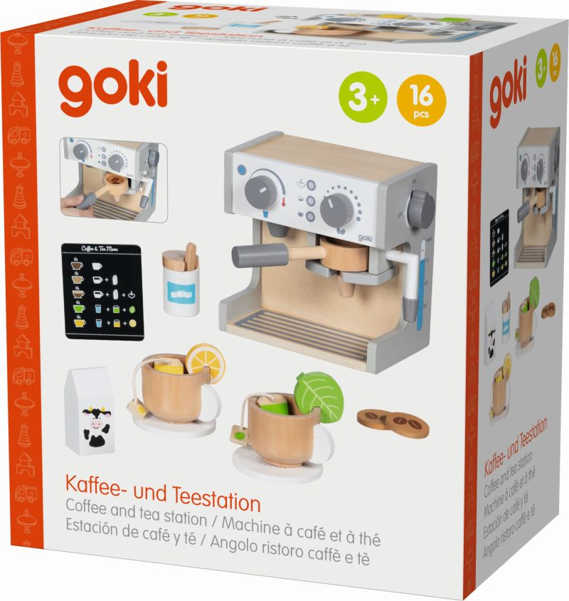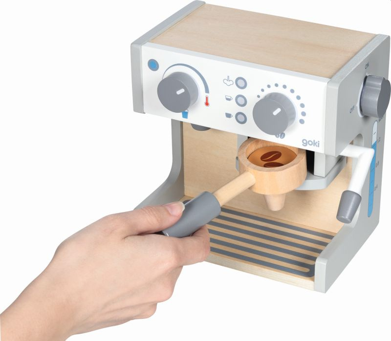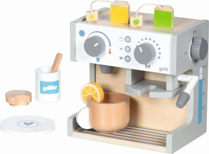 Stylowy biało szary ekspres Goki to doskonały wybór dla małych fanów kawowych i herbacianych rytuałów. Prosty w obsłudze, wyposażony w filiżanki, łyżeczki, torebki herbaty i inne dodatki, pozwala na wspaniałą zabawę w baristę. Solidne wykonanie z drewna gwarantuje trwałość i bezpieczeństwo. Świetnie sprawdzi się jako uzupełnienie dziecięcej kuchni.
