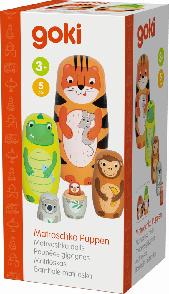 Zestaw składa się z 5 zwierzątek: Tygrysa Tavi, krokodyla, małpki, koali i papugi. Wykonane z wysokiej jakości drewna, są bezpieczne dla dzieci od 2. roku życia. Drewniane matrioszki Tygrys Tavi i Zwierzęta z dżungli Goki to idealny prezent dla małych odkrywców i sentymentalna podróż dla dorosłych.