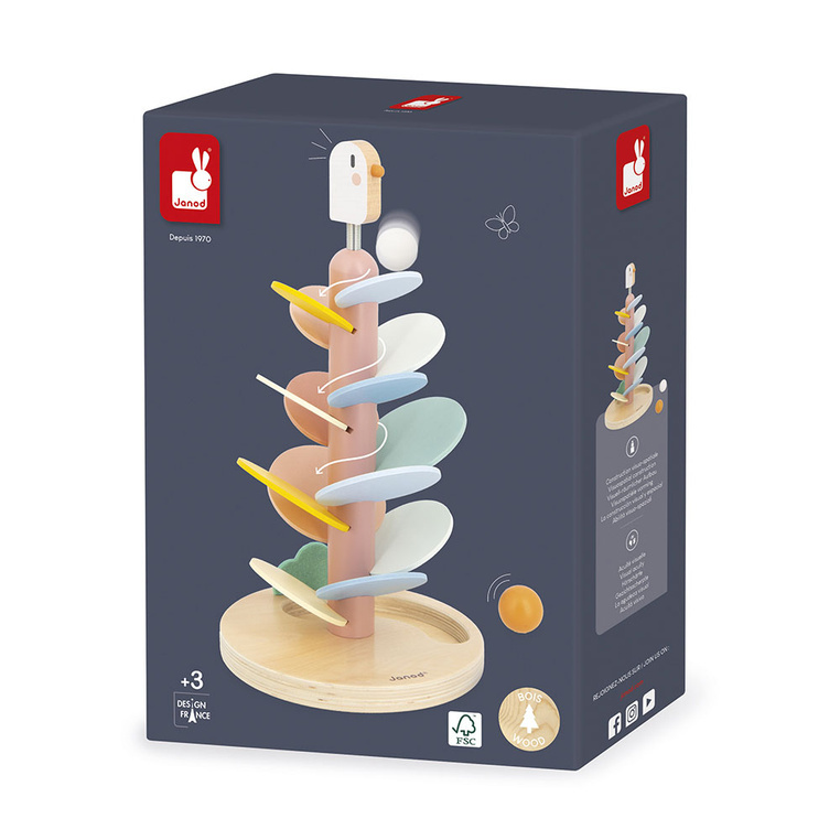 Ciekawość, skupienie i piękny design. Kulodrom drewniany Ptaszek z kolekcji Sweet Cocoon od Janod to zabawka, która angażuje na dłuższy czas. Dziecko samodzielnie układa 14 listków na drewnianej gałęzi, tworząc tor dla kulek. W zestawie znajdują się również wzorcowe karty i dwie kulki.