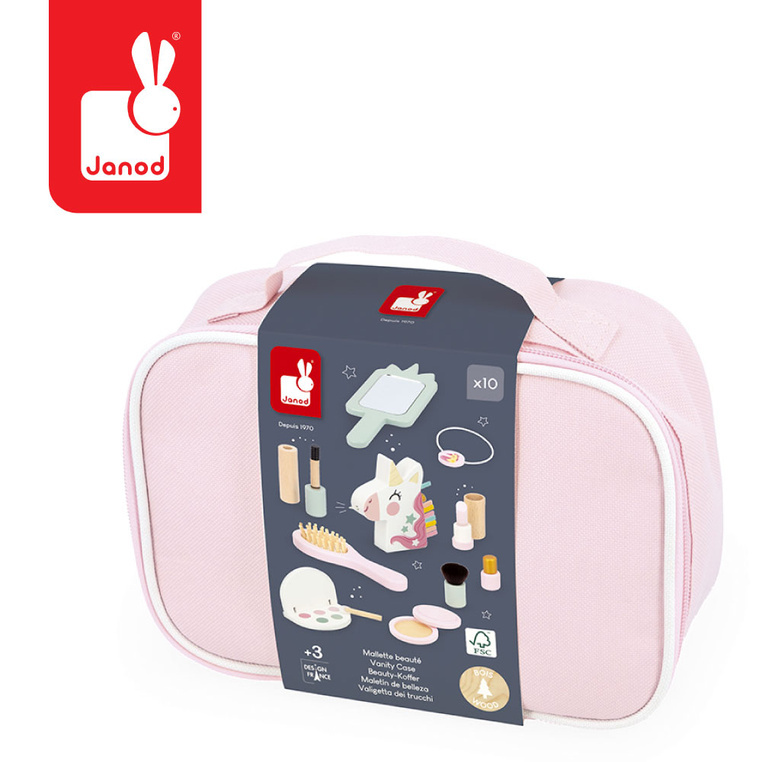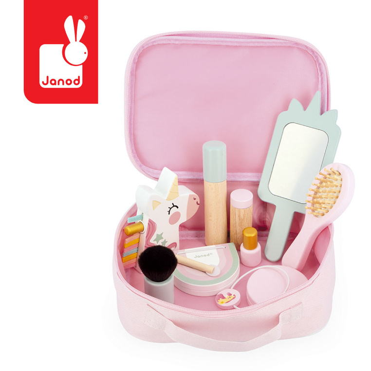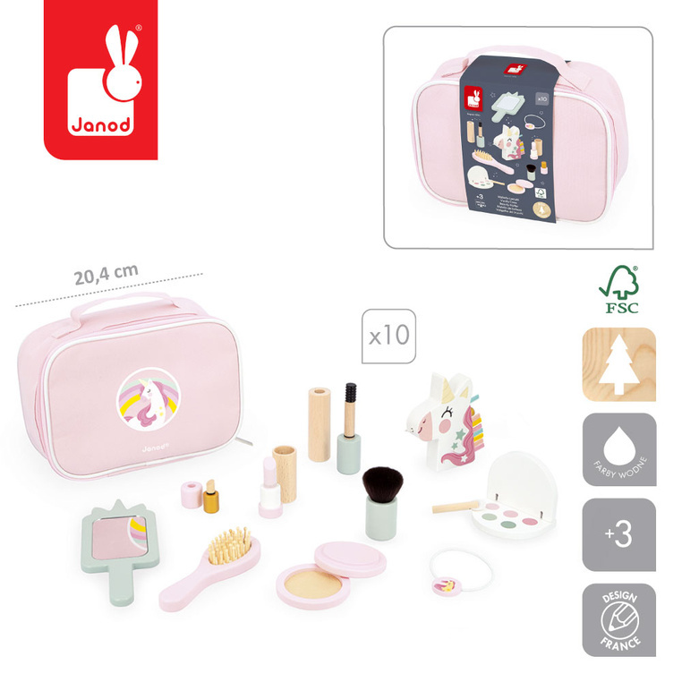 Mała Miss Jednorożec Janod to kosmetyczka z 10 drewnianymi akcesoriami dla małych miłośniczek makijażu. Urocze, realistyczne przybory zachęcają do kreatywnej zabawy. Całość zamknięta w różowej saszetce z rączką. Projekt francuskiej marki Janod.