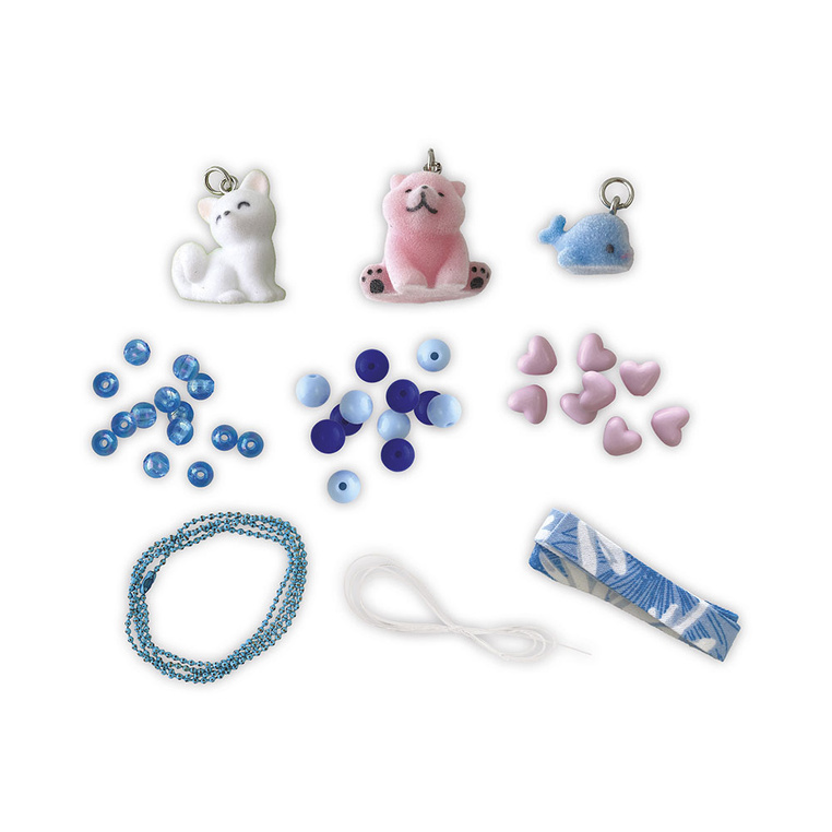 Zestaw kreatywny Małe zwierzątka Janod pozwala dziecku samodzielnie stworzyć jeden naszyjnik i dwie bransoletki z koralików, wstążek i uroczych zawieszek w kształcie wieloryba, niedźwiadka i kotka, rozwijając przy tym wyobraźnię, precyzję ruchów i kreatywność.