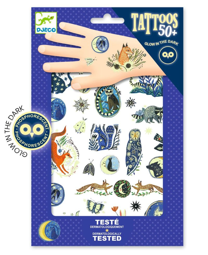 Leśna magia na skórze, która ożywa po zmroku. Tatuaże Djeco Las nocą to 2 arkusze wzorów, które świecą w ciemności i łatwo się aplikują.