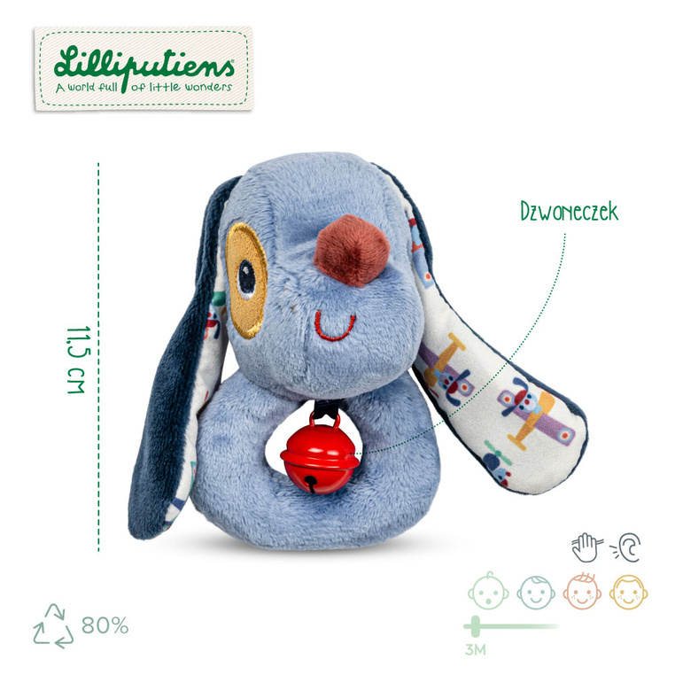 Niewielka zabawka, a tyle możliwości do odkrywania. Pluszowy Piesek Jules w formie grzechotki to przyjaciel na początek dziecięcej drogi. Wesoły, miękki, łatwy do chwycenia i zawsze gotowy, by zadzwonić dzwoneczkiem na powitanie.