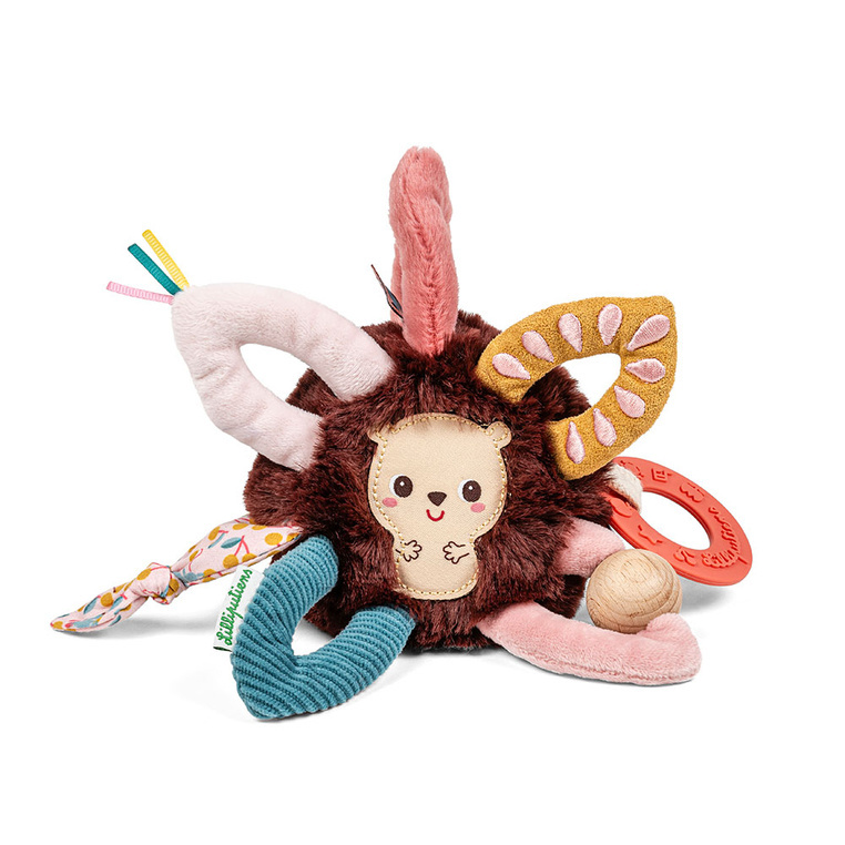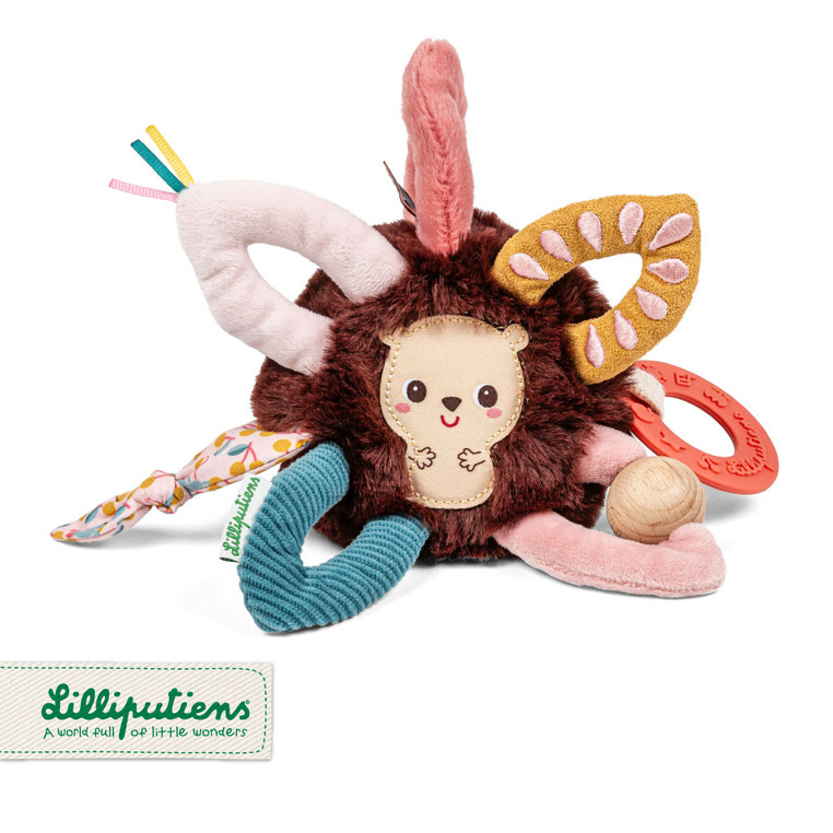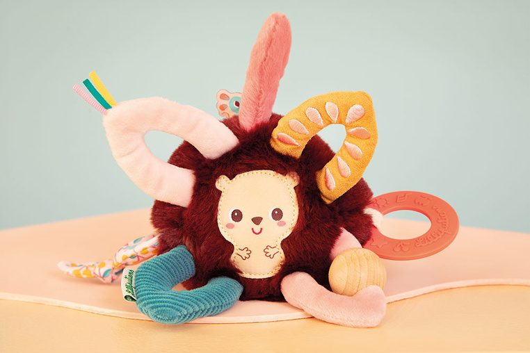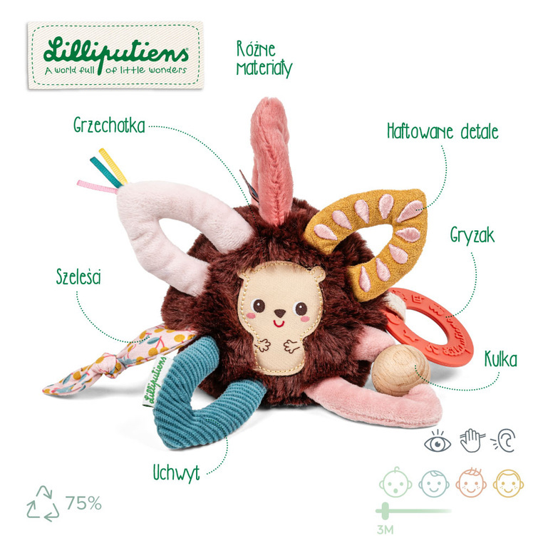 Różnorodne uchwyty z tkanin, szeleszczące elementy, grzechotka w główce i silikonowy gryzak czynią z niej zabawkę o wielu możliwościach. Każdy fragment został zaprojektowany tak, by stymulować rozwój zmysłów i motoryki niemowlęcia.