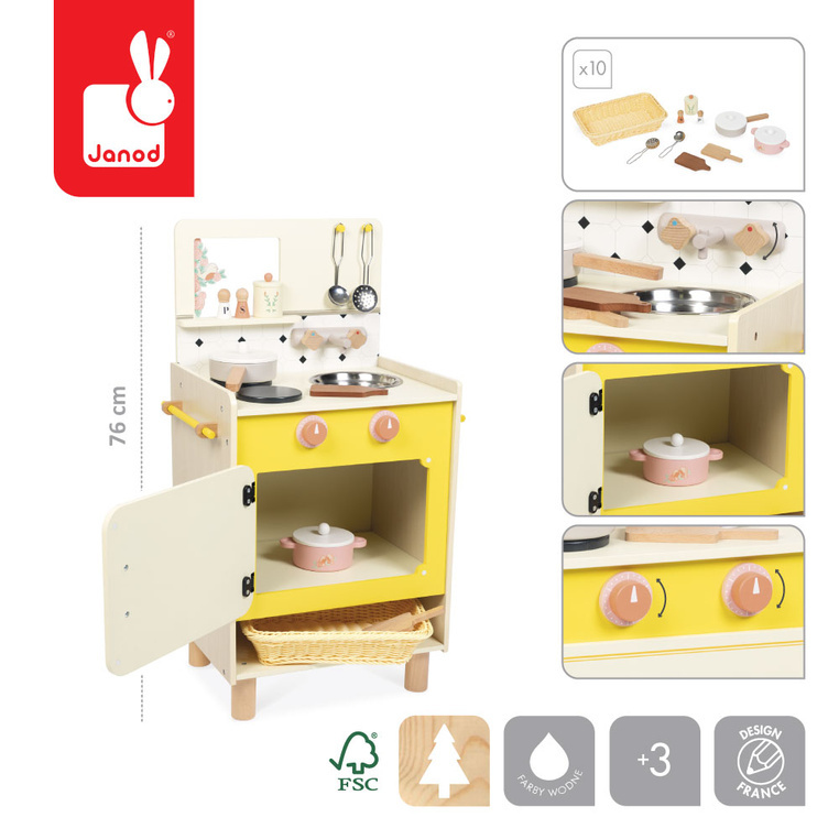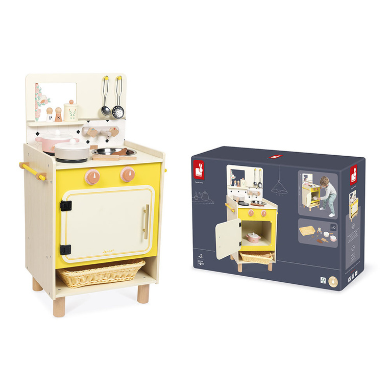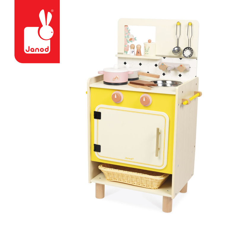 Kuchnia Shiny Grandma Janod zainspirowana stylem retro została wykonana z drewna i dopracowana w najdrobniejszych detalach. Jest to idealna propozycja dla dzieci, które lubią naśladować dorosłych. W zestawie znajdują się m.in. garnek, patelnia, cedzak i przyprawy, a także wiklinowy koszyk.