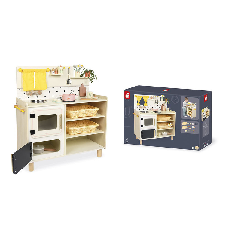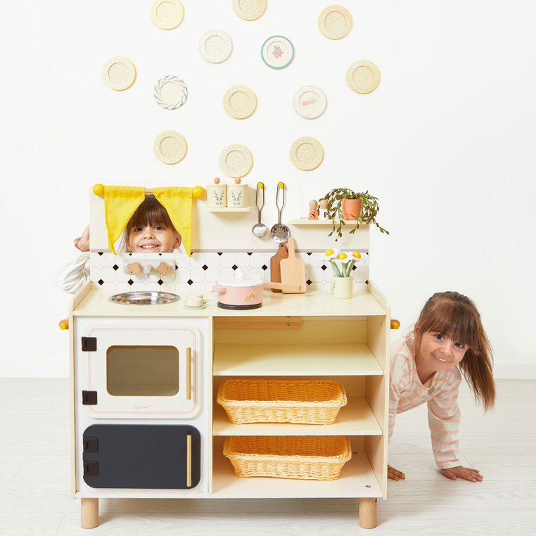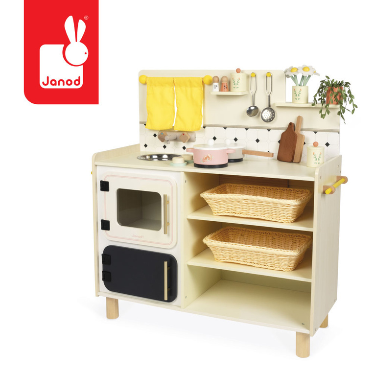 Kuchnia zainspirowana stylem retro została wykonana z drewna i dopracowana w najdrobniejszych detalach. Jest to idealna propozycja dla dzieci, które lubią naśladować dorosłych. W zestawie znajdują się aż 19 akcesoriów, a wśród nich m.in. garnek, patelnia, cedzak i przyprawy, a także wiklinowy koszyk.