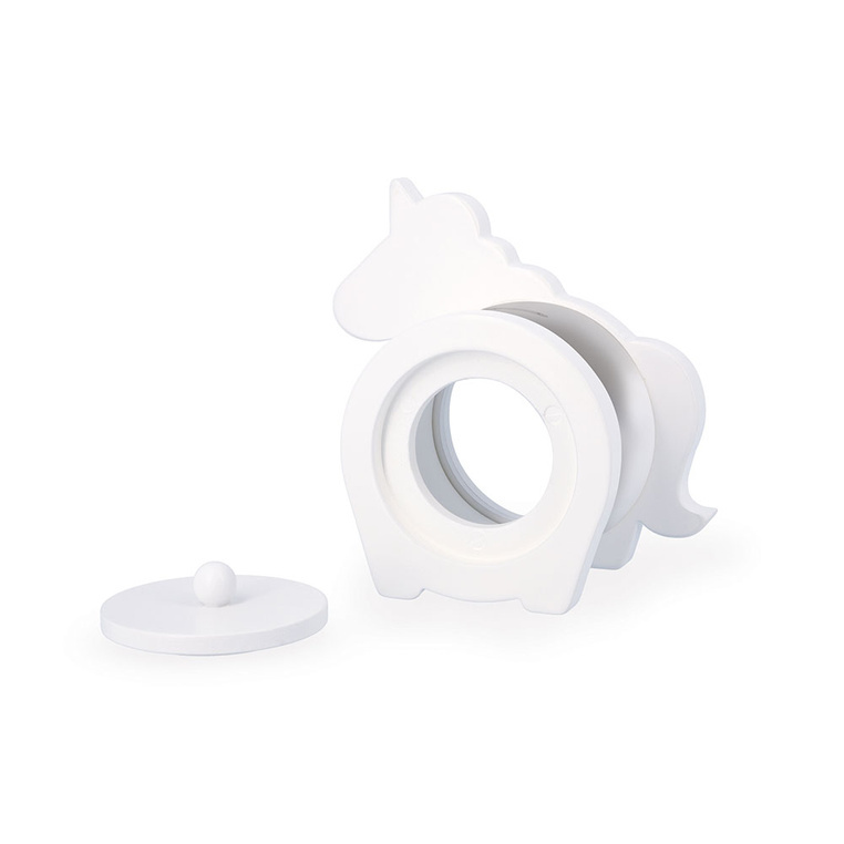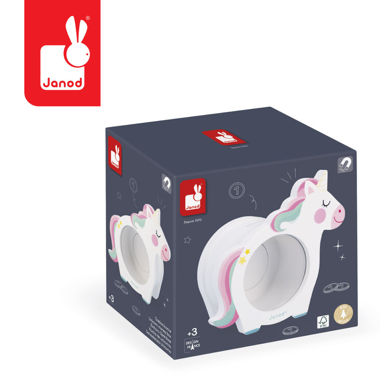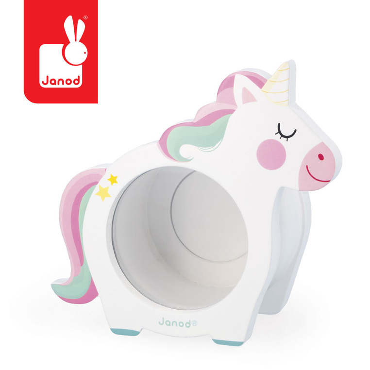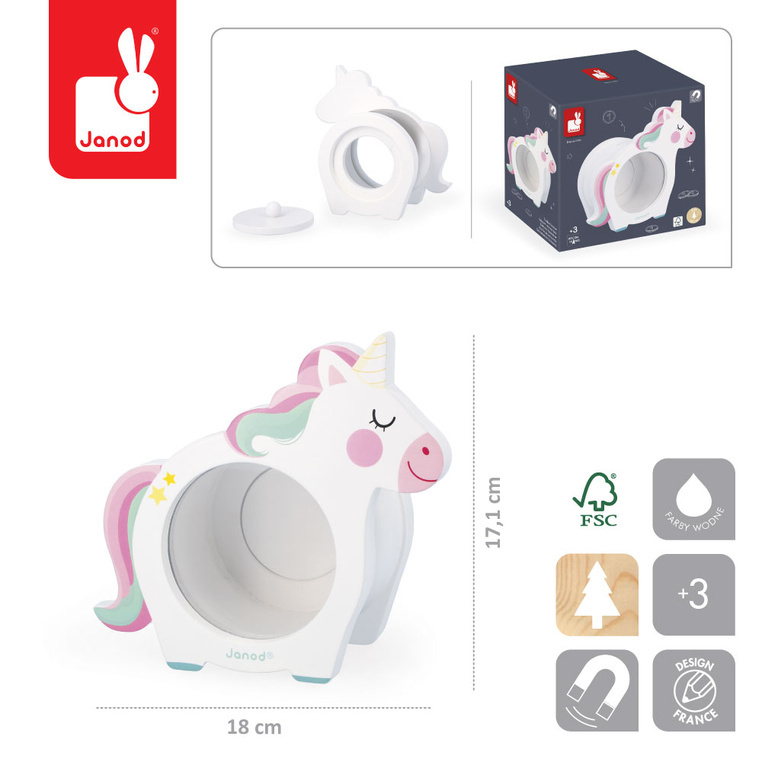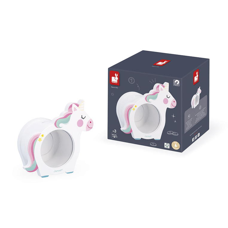 Drewniana skarbonka jednorożec Janod to urocza dekoracja pokoju, która pozwala dzieciom bawić się i jednocześnie uczyć oszczędzania, rozwijając przy tym kreatywność i wyobraźnię.