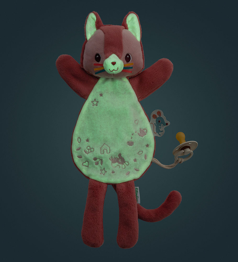 Płaska forma umożliwia użycie jako komfortera, a otwór w brzuszku pozwala przekształcić ją w pacynkę do zabawy. Kotka Jeanne posiada sznurkową zawieszkę do smoczka, a jej brzuszek i uszy świecą w ciemności, wspierając rozwój wzroku i poczucie bezpieczeństwa.