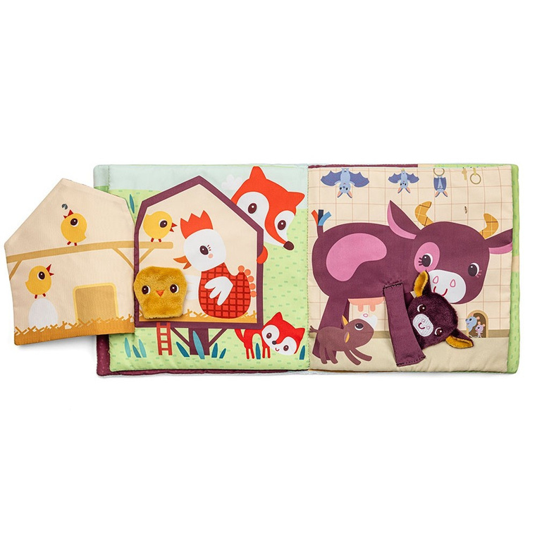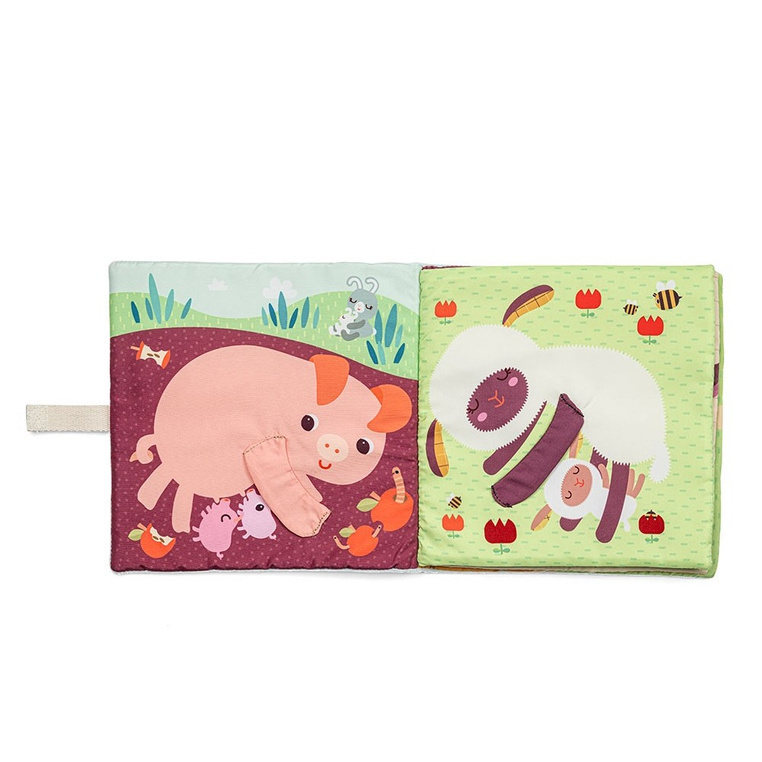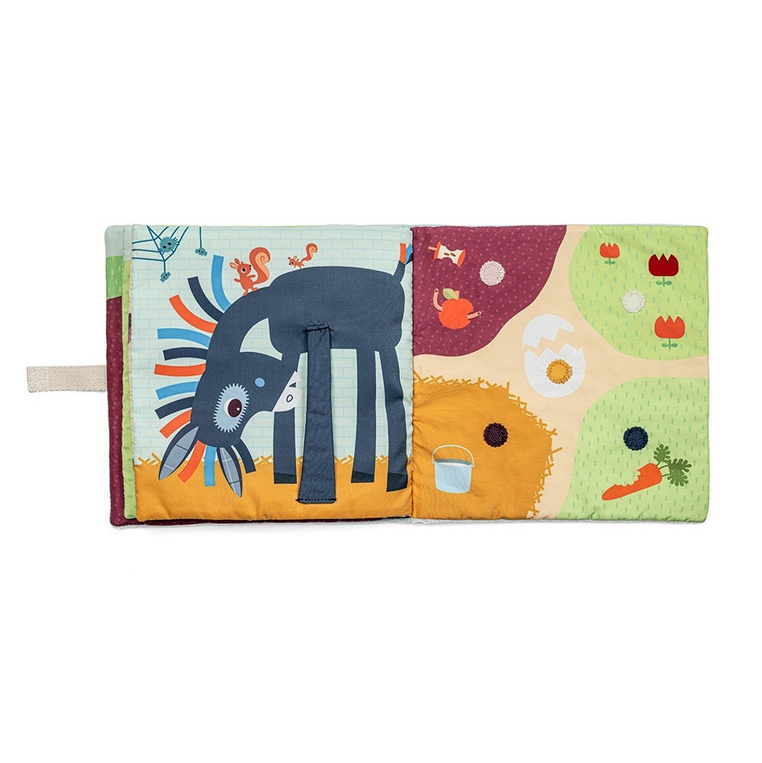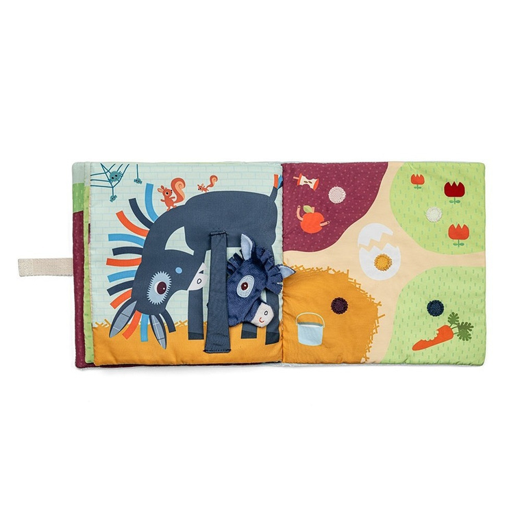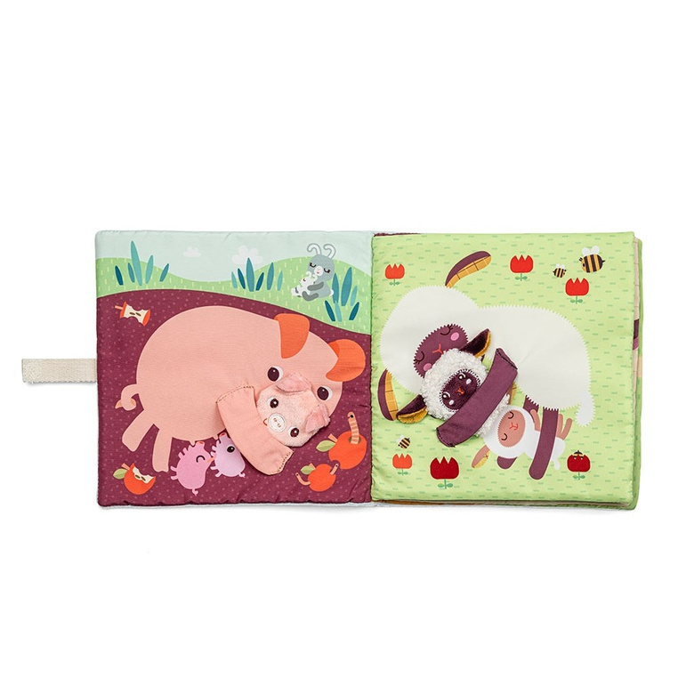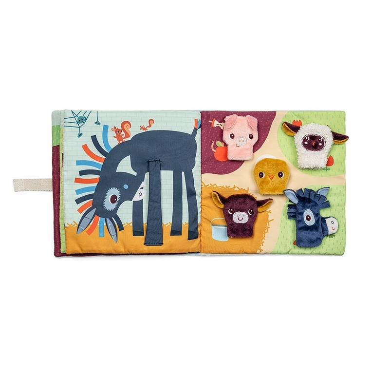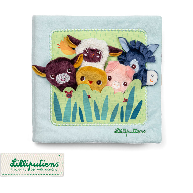 Książeczka aktywizująca z mini-pacynkami Młode zwierzątka belgijskiej marki Lilliputiens to pierwsza sensoryczna zabawka dla maluszków od 12 miesiąca życia. Na okładce znajduje się łąka-kieszonka z 5 zwierzątkami z farmy: krówką, owieczką, świnką, kaczorkiem i osiołkiem, które można „ożywiać”, wkładając je na palec.