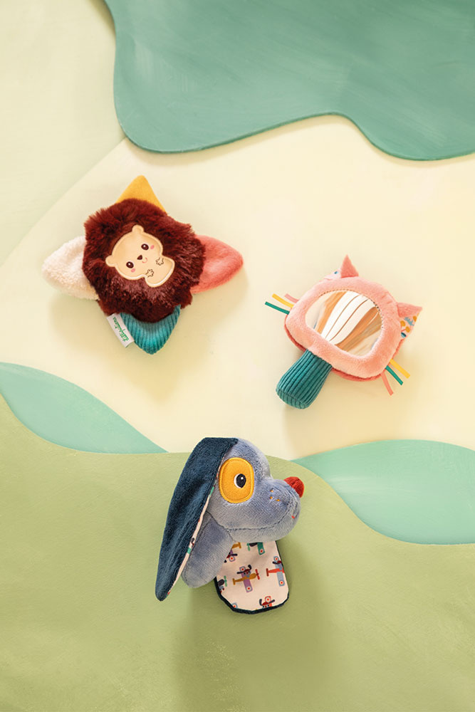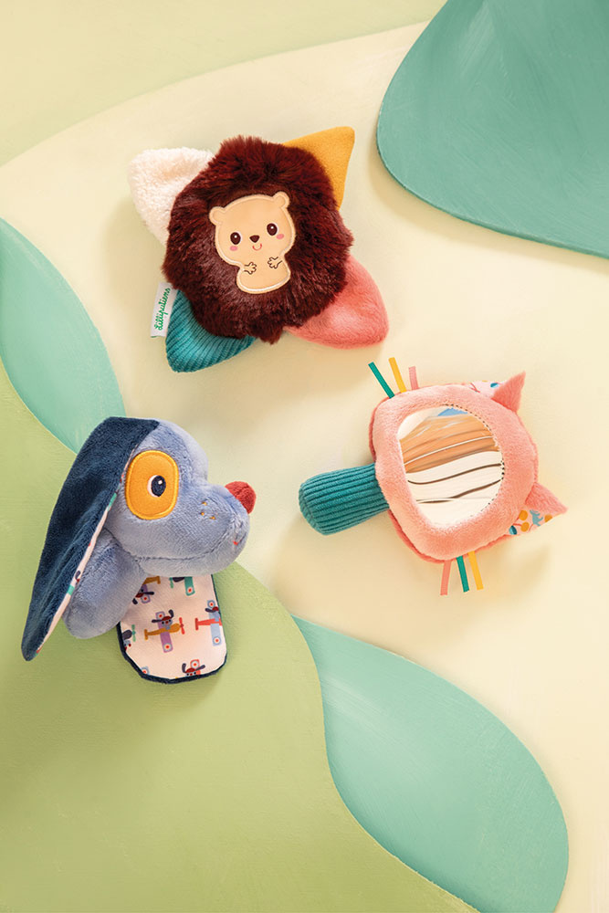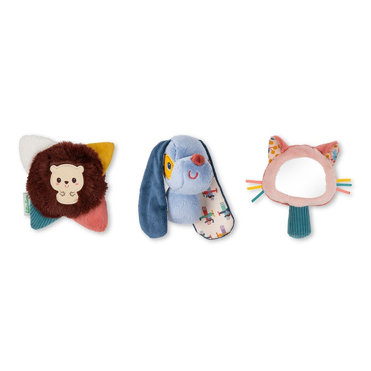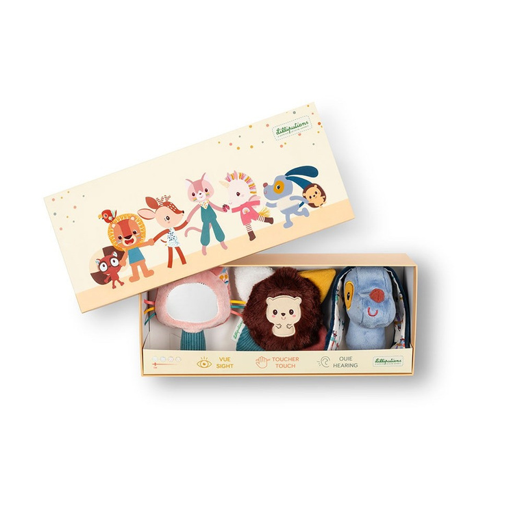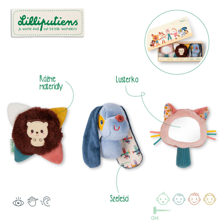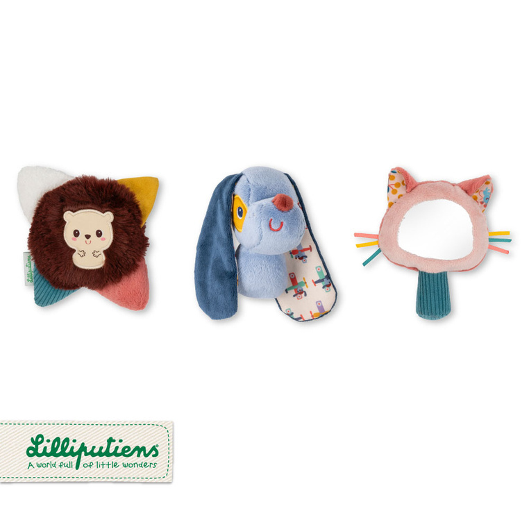 Zestaw 3 miękkich, wielofunkcyjnych zabawek Lilliputiens z kolekcji Piesek Jules to zabawka rozwojowa dla niemowląt. Zestaw zawiera: Jeżyka Leona, Pieska Julesa z szeleszczącymi uszami i Kotkę Jeanne z bezpiecznym lusterkiem.