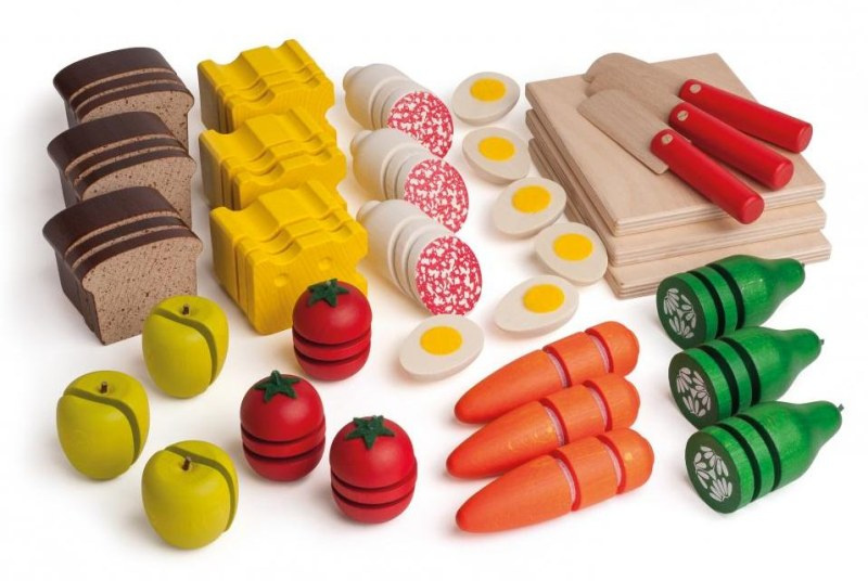 Drewniany Zestaw akcesoriów spożywczych na rzep do krojenia i zabawy 27 elementów Erzi