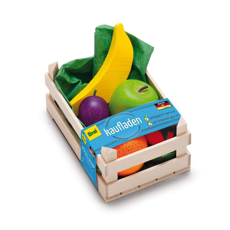 Drewniane owoce marki Erzi świetnie sprawdzą się podczas zabawy w sklep i kuchni dla dzieci. Umieszczone w eleganckiej drewnianej skrzyneczce na pewno będą dobrze się sprzedawać. Zestaw zawiera 6 różnych elementów.