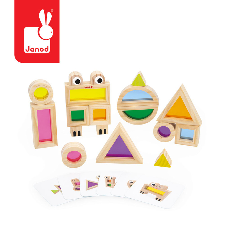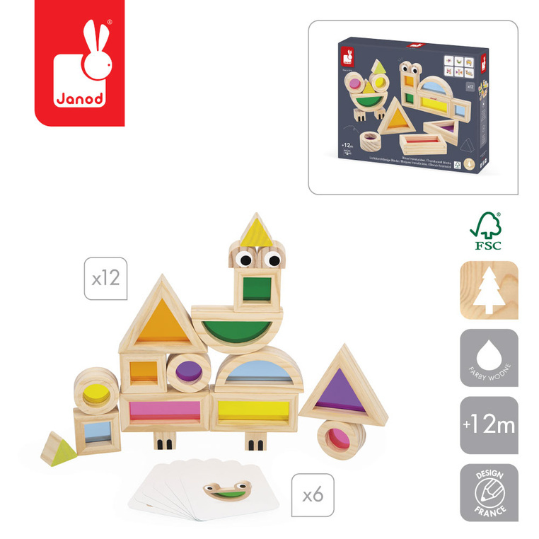 Sensoryczne klocki drewniane dla dzieci przeźroczyste kolorowe Janod