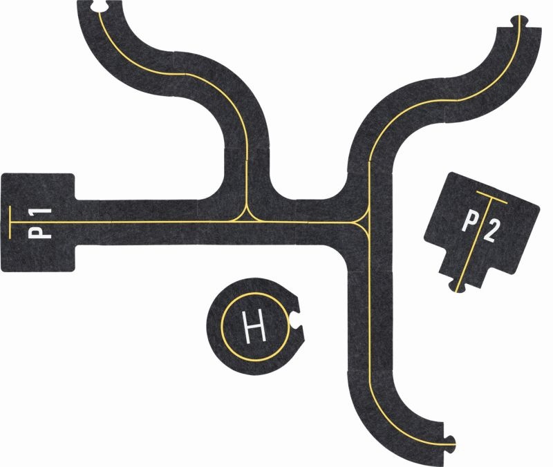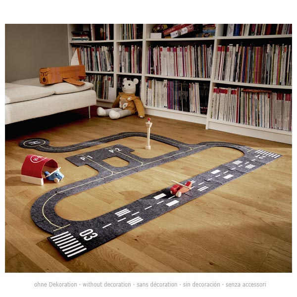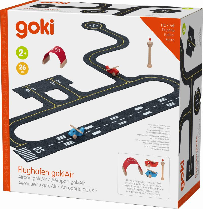 Zestaw lotniskowy Goki to filcowe pasy startowe oraz drewniane samoloty, wieża i hangar, które można ustawiać według własnego pomysłu. Prosta forma zachęca do wymyślania wielu scenariuszy zabawy.