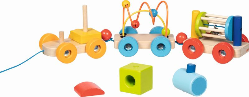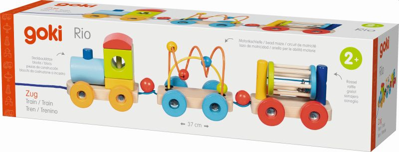 Rodzice docenią funkcjonalność i atrakcyjność Drewnianej zabawki do ciągnięcia dla dzieci Pociąg Rio Goki, która rozwija motorykę i zachęca do aktywności ruchowej malucha.