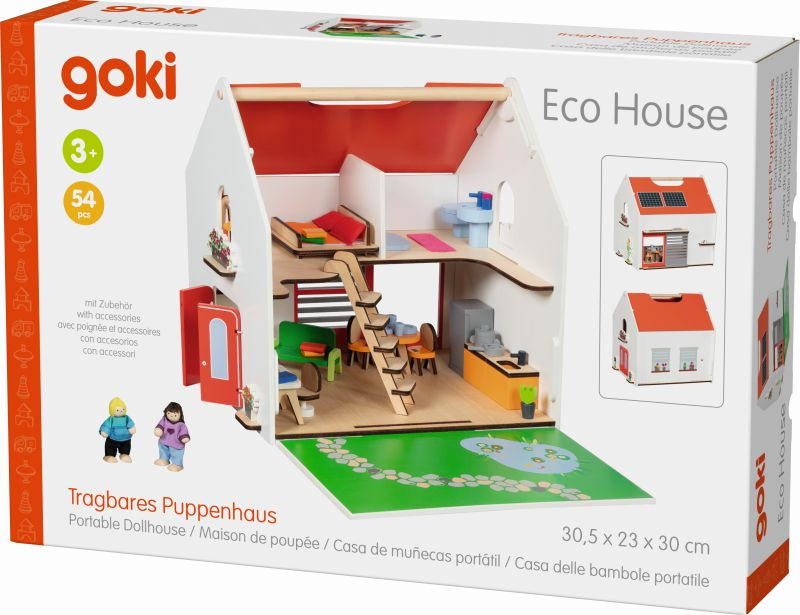Kompaktowy, przenośny i pełen szczegółów. Domek dla lalek Eco House Goki z mebelkami i figurkami to zabawka, która zachęca dzieci do twórczej i wspólnej zabawy.